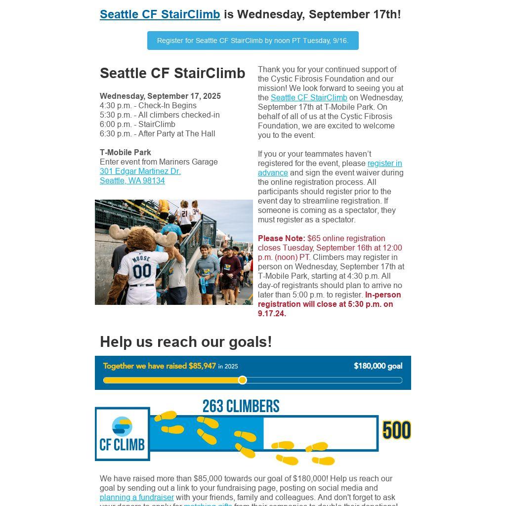 Thank you for your continued support of the Cystic Fibrosis Foundation and our mission! We look forward to seeing you at the Seattle CF StairClimb on Wednesday, September 17th at T-Mobile Park. On behalf of all of us at the Cystic Fibrosis Foundation, we are excited to welcome you to the event.