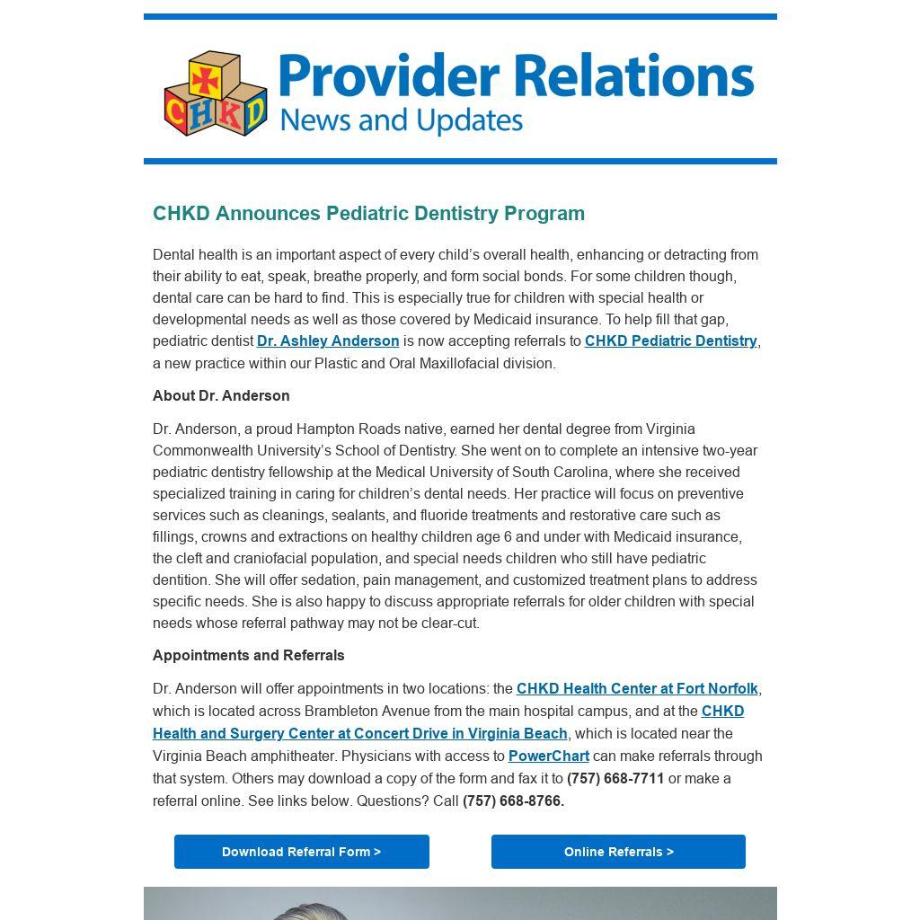The preferred distribution method of the Provider Relations newsletter is via email. Please contact a CHKD Provider Relations Liaison to be added to our email distribution list or signup online here.