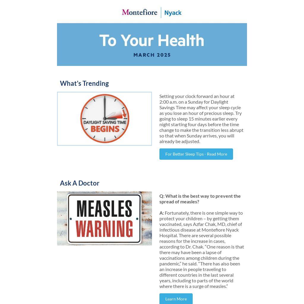 Join Montefiore Nyack Hospital on a journey to empowered health. Our monthly enewsletter, To Your Health offers personalized content, reducing stress and boosting confidence in healthcare decisions. While our resources educate, consult your provider for personalized advice. Montefiore Nyack Hospital is not responsible for any misuse of information. Realize your health potential with us!