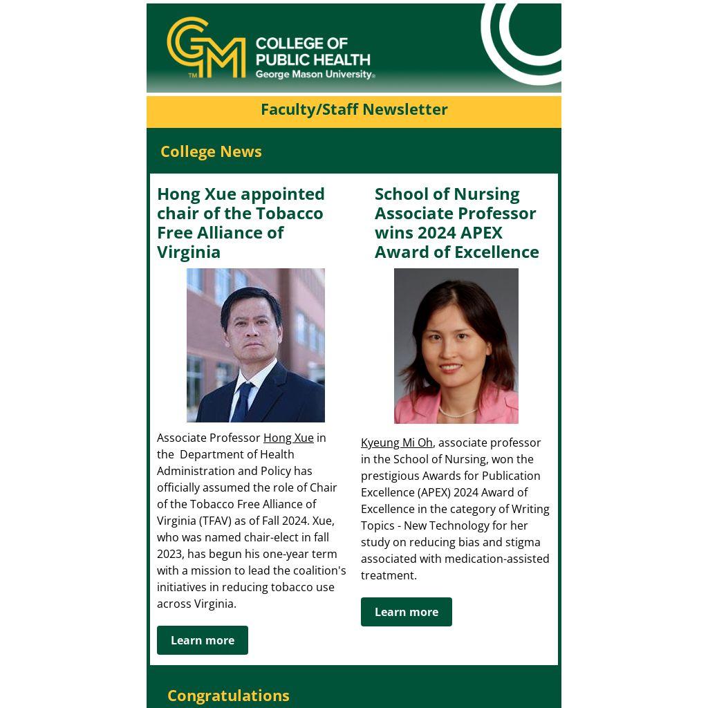 Associate Professor Hong Xue in the Department of Health Administration and Policy has officially assumed the role of Chair of the Tobacco Free Alliance of Virginia (TFAV) as of Fall 2024. Xue, who was named chair-elect in fall 2023, has begun his one-year term with a mission to lead the coalition's initiatives in reducing tobacco use across Virginia.