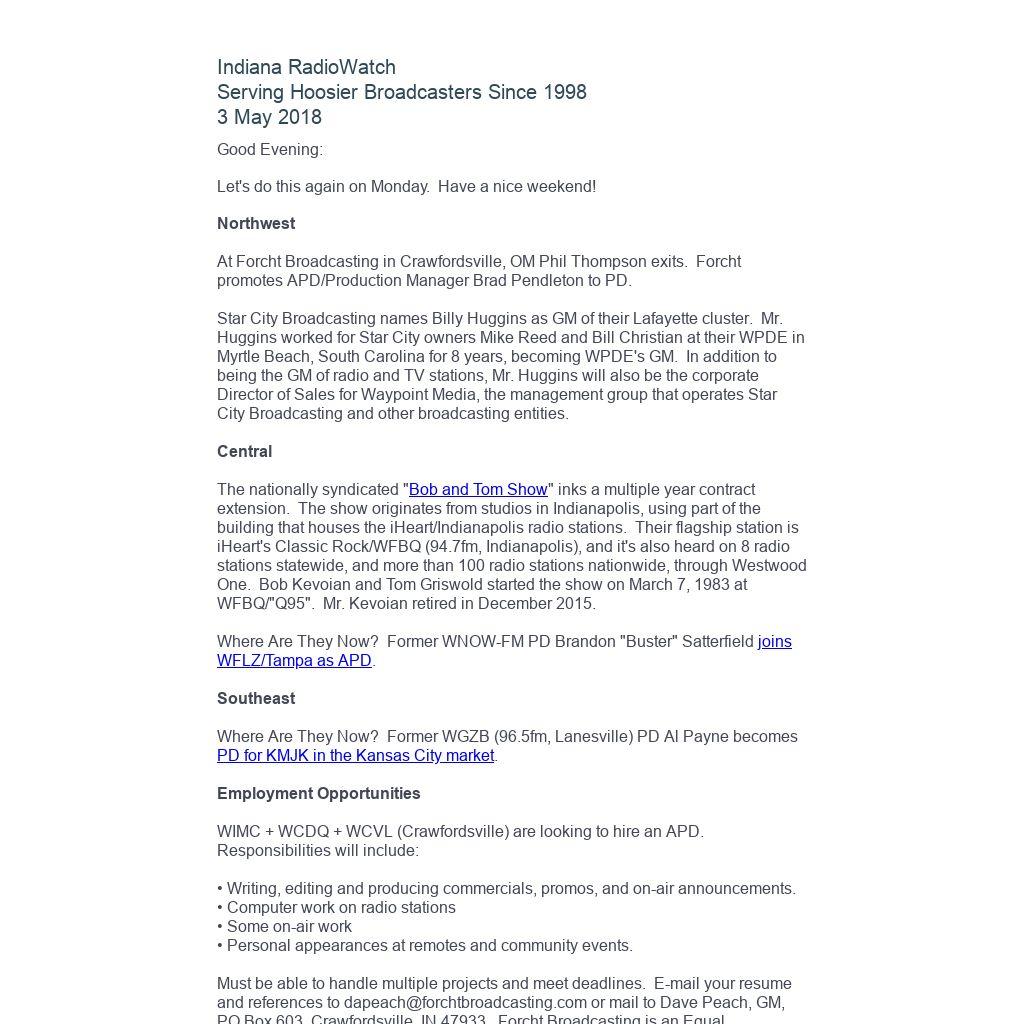 Indiana RadioWatch subscriptions are free. To subscribe, send an e-mail to irw@well.com and we'll add you. After publication, we archive Indiana RadioWatch on the Indiana Radio Archive at http://www.indianaradio.net. Please e-mail us your news stories and employment opportunities.