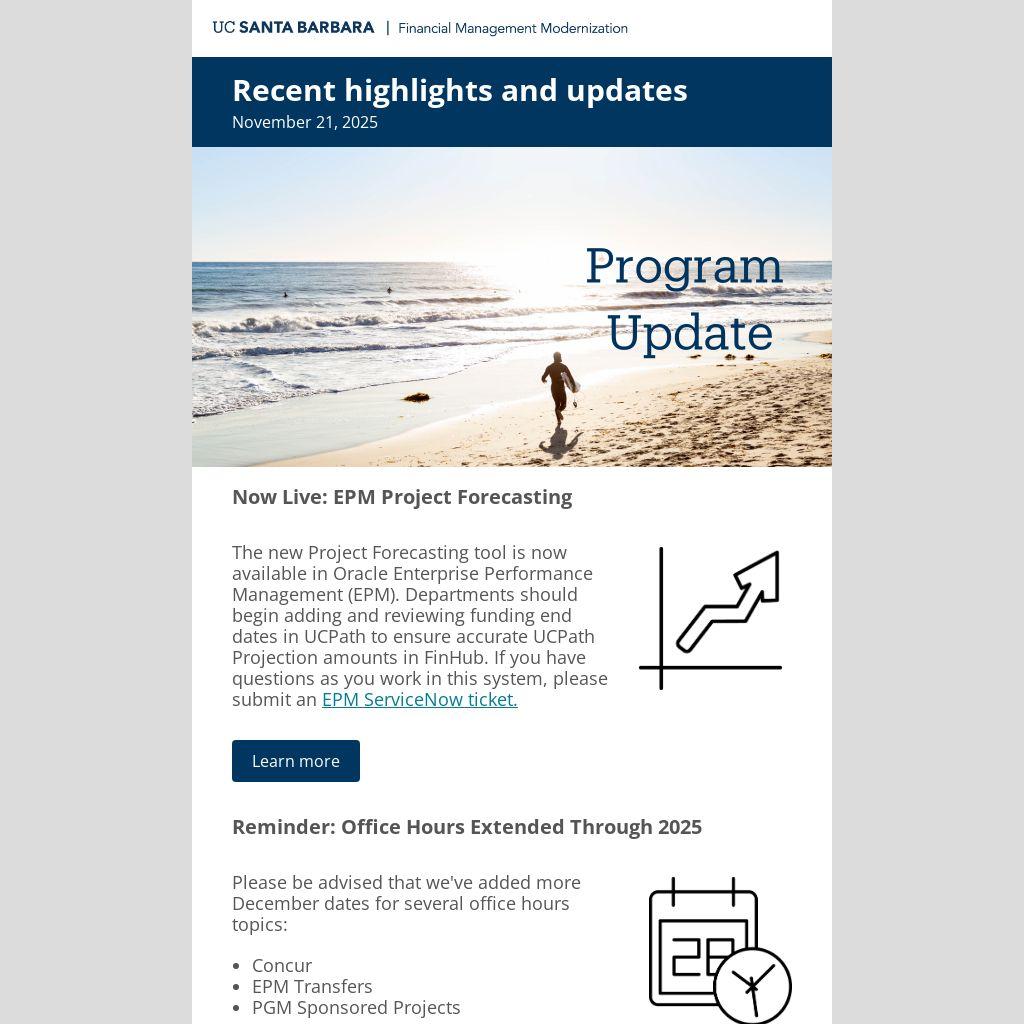 The new Project Forecasting tool is now available in Oracle Enterprise Performance Management (EPM). Departments should begin adding and reviewing funding end dates in UCPath to ensure accurate UCPath Projection amounts in FinHub. If you have questions as you work in this system, please submit an EPM ServiceNow ticket.