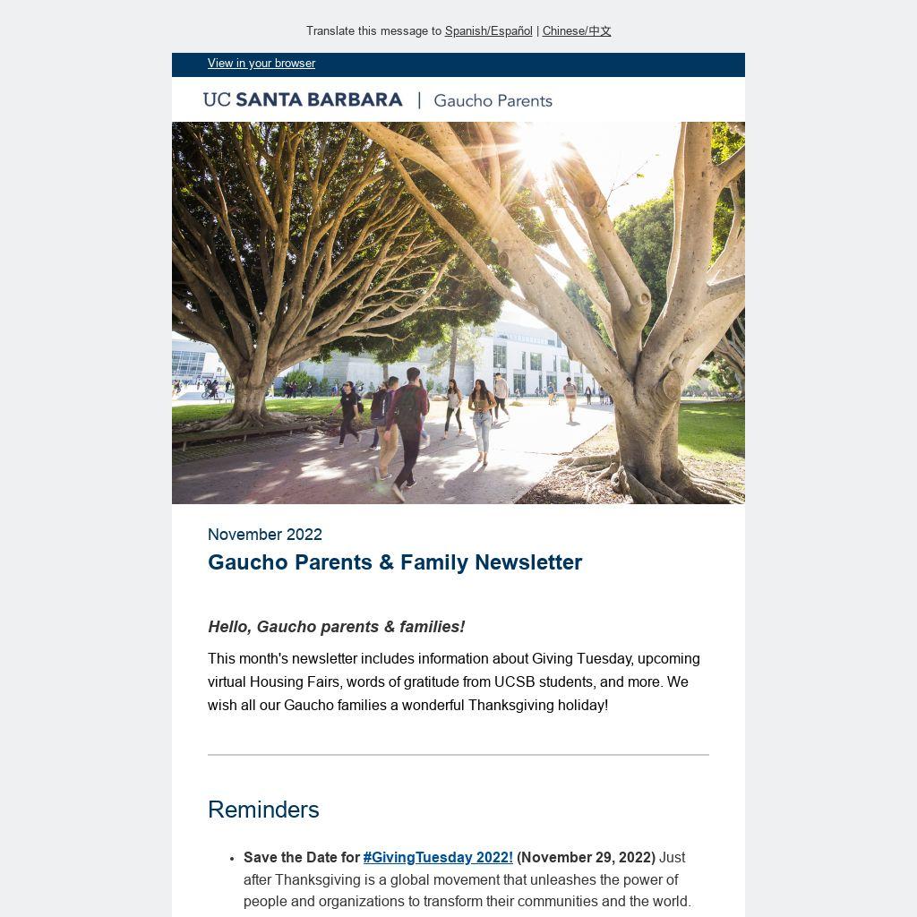 This month's newsletter includes information about Giving Tuesday, upcoming virtual Housing Fairs, words of gratitude from UCSB students, and more. We wish all our Gaucho families a wonderful Thanksgiving holiday!