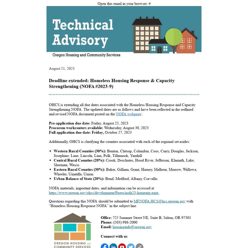 OHCS is extending all due dates associated with the Homeless Housing Response and Capacity Strengthening NOFA. The updated dates are as follows and have been reflected in the redlined and revised NOFA document posted on the NOFA webpage: