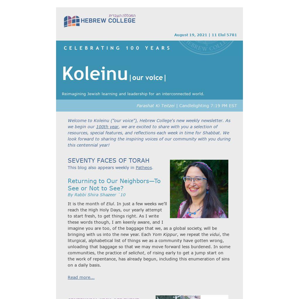 Welcome to Koleinu ("our voice"), Hebrew College's new weekly newsletter. As we begin our 100th year, we are excited to share with you a selection of resources, special features, and reflections each week in time for Shabbat. We look forward to sharing the inspiring voices of our community with you during this centennial year!