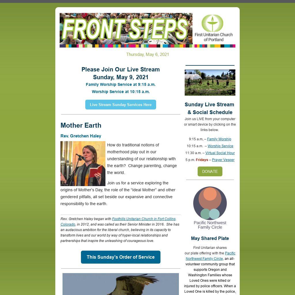 Church Communications: Do you receive messages from the church including this weekly E-News and our Staying Connected emails? To receive church emails send a note to etafuri@firstunitarianportland.org.