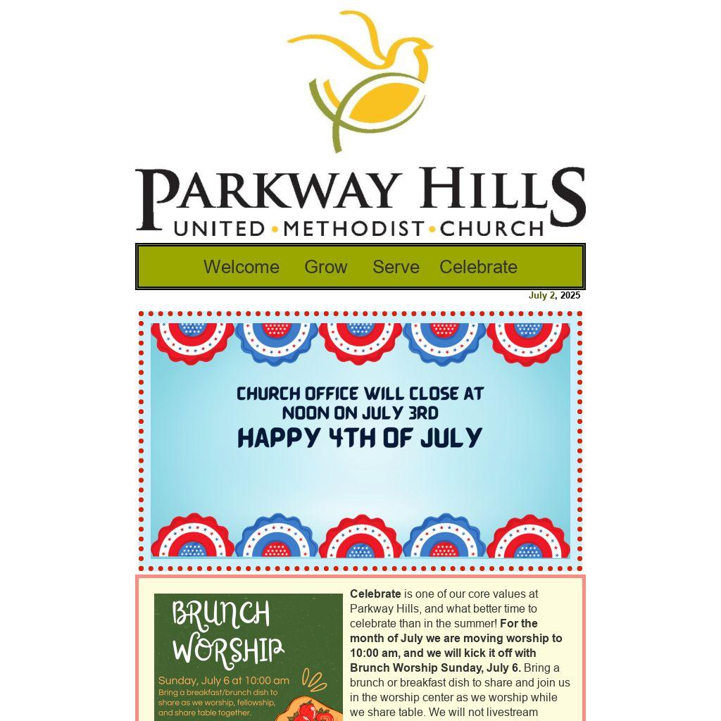 Celebrate is one of our core values at Parkway Hills, and what better time to celebrate than in the summer! For the month of July we are moving worship to 10:00 am, and we will kick it off with Brunch Worship Sunday, July 6. Bring a brunch or breakfast dish to share and join us in the worship center as we worship while we share table. We will not livestream worship Sunday, July 6. With the exception of Open Doors, Sunday School will not meet in July. Open Doors will meet at 9:00 am throughout July.