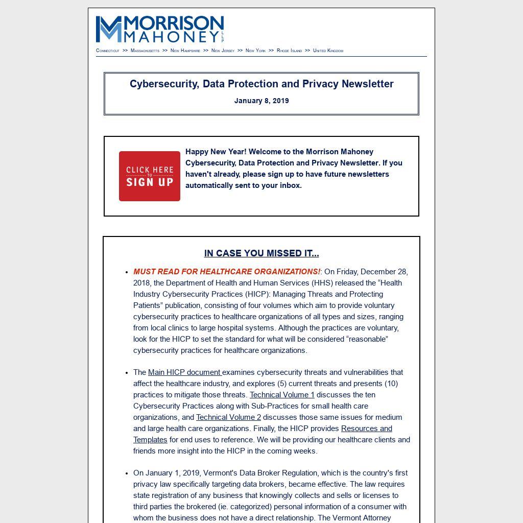 Happy New Year! Welcome to the Morrison Mahoney Cybersecurity, Data Protection and Privacy Newsletter. If you haven't already, please sign up to have future newsletters automatically sent to your inbox.