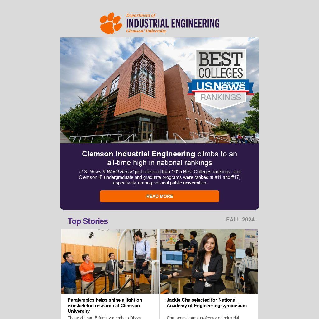 Clemson IE continues to shine nationally, as evidenced by the latest U.S. News & World Report rankings of public institutions for graduate (#17) and undergraduate (#11) programs in industrial engineering — the highest ranking of any department on campus. This recognition is a testament to the hard work of our faculty, staff, students and alumni and the unique contributions they are making.