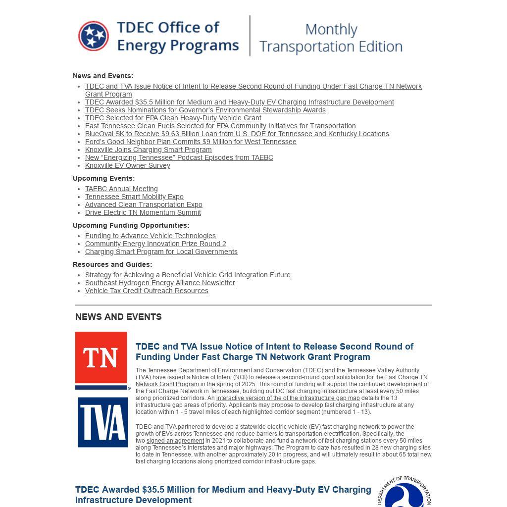 | TDEC and TVA Issue Notice of Intent to Release Second Round of Funding Under Fast Charge TN Network Grant Program |