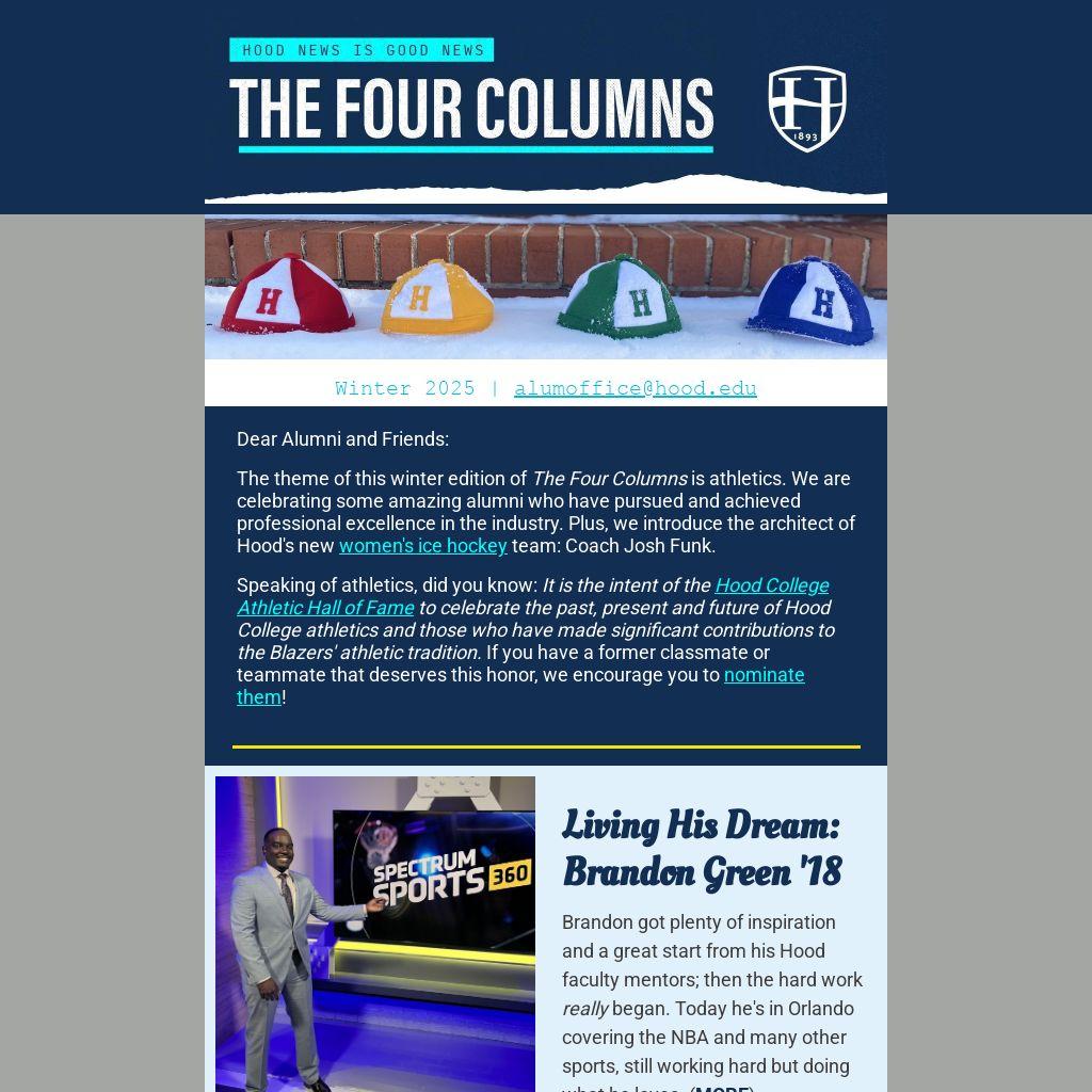 The theme of this winter edition of The Four Columns is athletics. We are celebrating some amazing alumni who have pursued and achieved professional excellence in the industry. Plus, we introduce the architect of Hood's new women's ice hockey team: Coach Josh Funk.