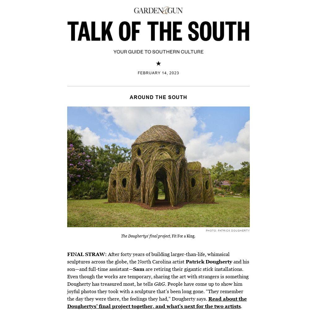 FINAL STRAW: After forty years of building larger-than-life, whimsical sculptures across the globe, the North Carolina artist Patrick Dougherty and his son—and full-time assistant—Sam are retiring their gigantic stick installations. Even though the works are temporary, sharing the art with strangers is something Dougherty has treasured most, he tells G&G. People have come up to show him joyful photos they took with a sculpture that’s been long gone. “They remember the day they were there, the feelings they had,” Dougherty says. Read about the Doughertys’ final project together, and what’s next for the two artists.
