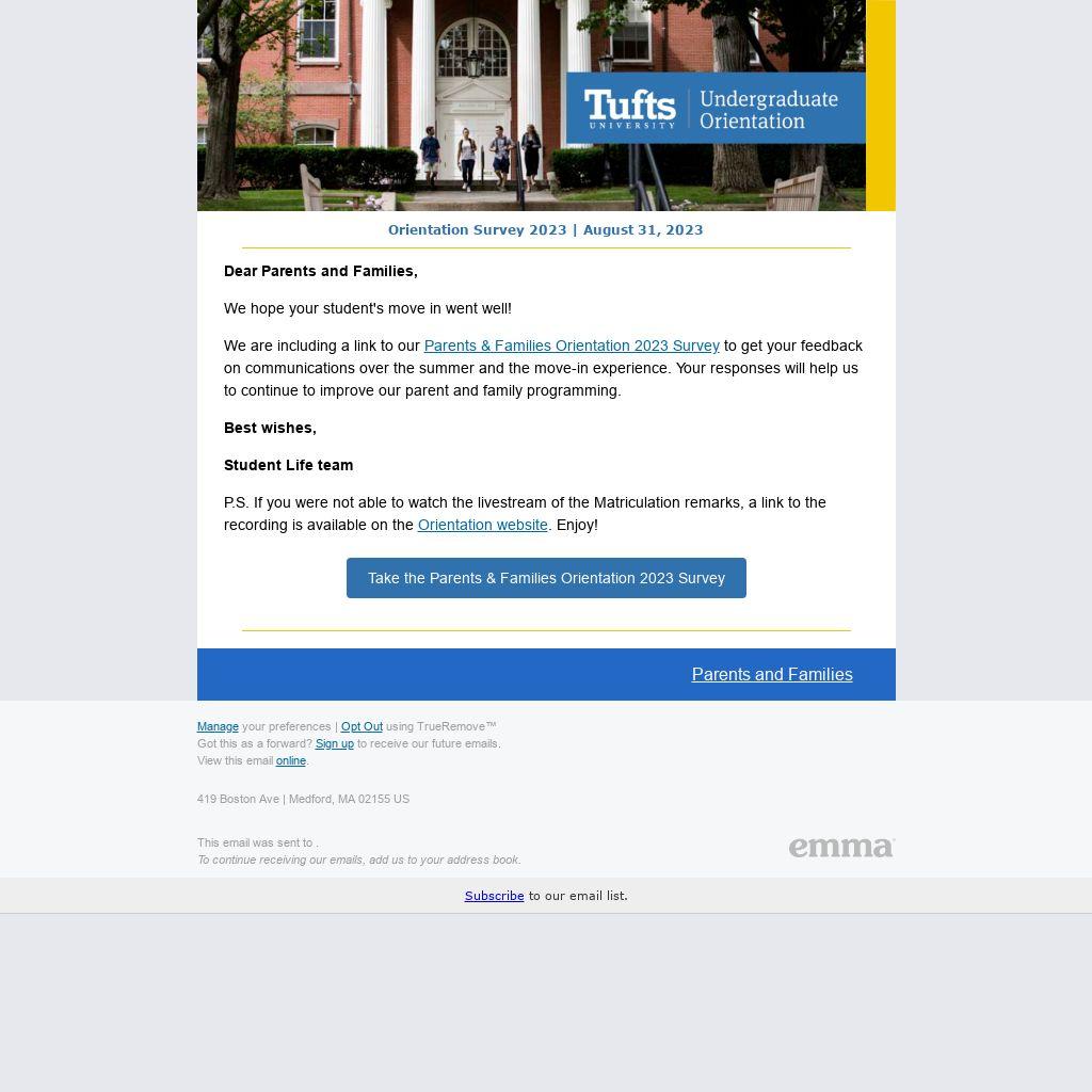 We are including a link to our Parents & Families Orientation 2023 Survey to get your feedback on communications over the summer and the move-in experience. Your responses will help us to continue to improve our parent and family programming.