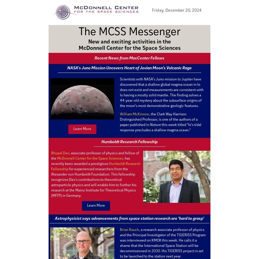 William McKinnon, the Clark Way Harrison Distinguished Professor, is one of the authors of a paper published in Nature this week titled "Io’s tidal response precludes a shallow magma ocean."