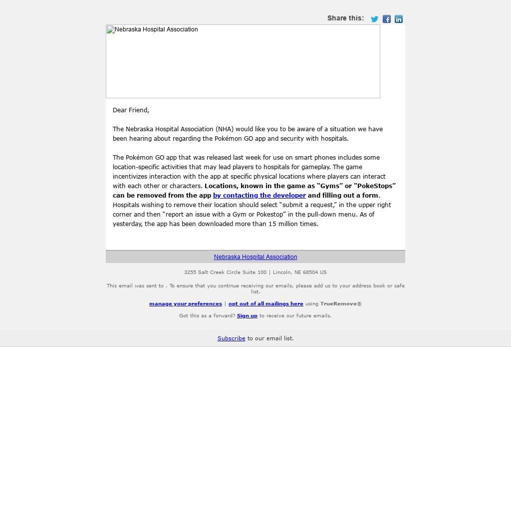 The Nebraska Hospital Association (NHA) would like you to be aware of a situation we have been hearing about regarding the Pokémon GO app and security with hospitals.