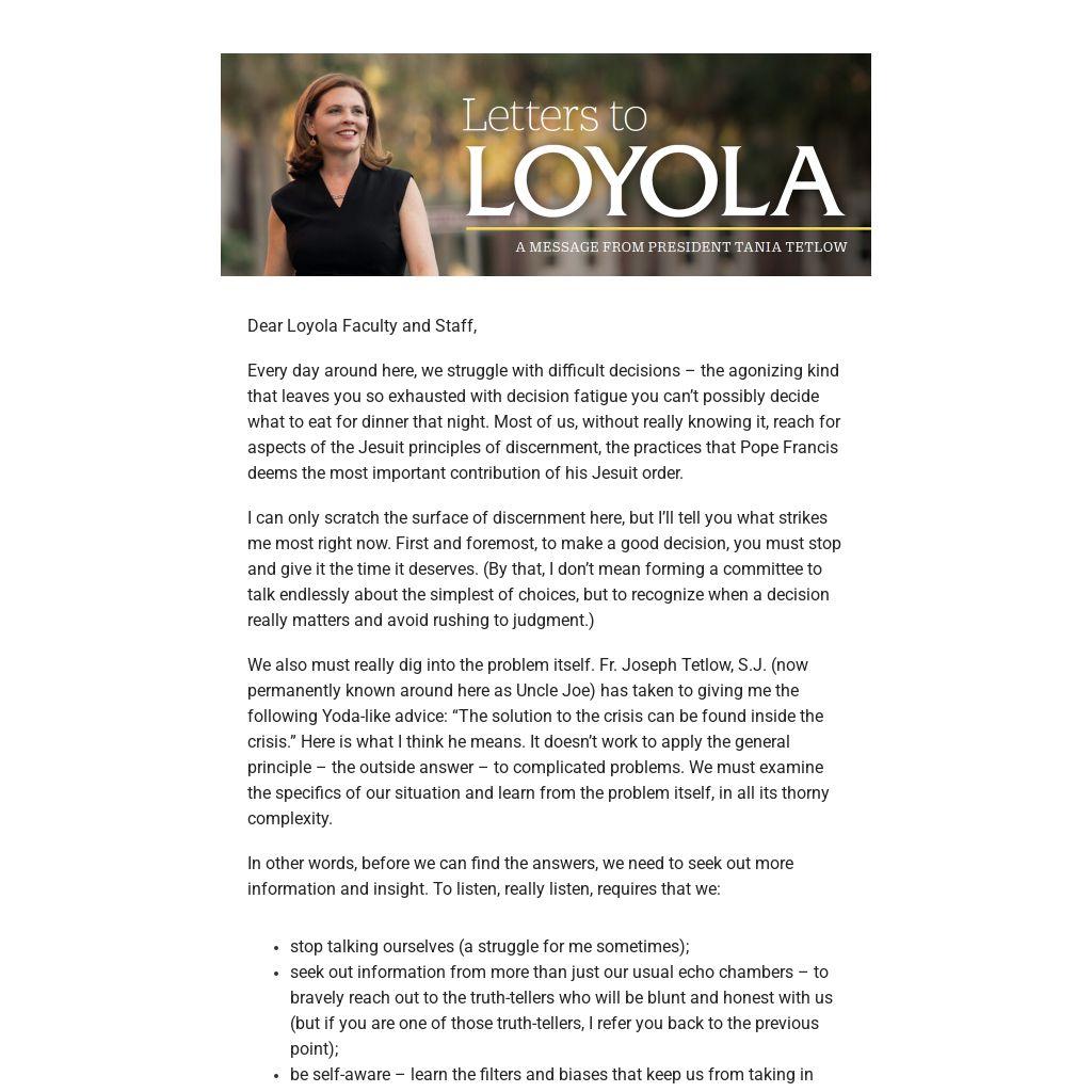 Thank you for all of the hard decisions you make for Loyola, and for doing it with patience, courage and wisdom.