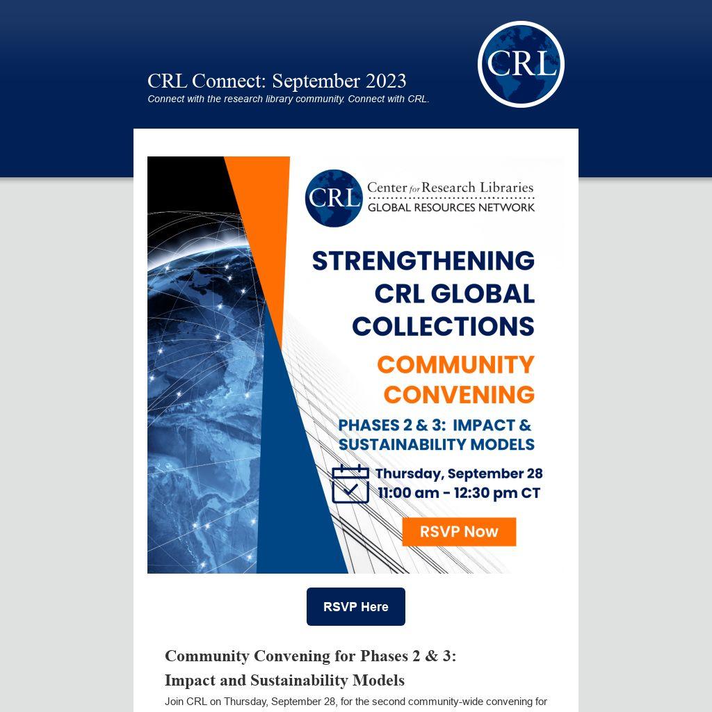 In 2023, the CRL community is convening, in consultation with the Educopia Institute, to weave our global collections activities together into a holistic strategy that leverages CRL's unique community, scale, and infrastructure to build community-stewarded global collections in service of research and scholarship. Community members will be asked to participate in various ways throughout the process, from sprint groups to review periods to community convenings.