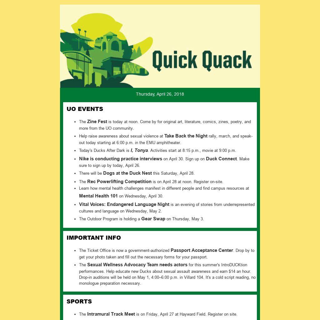 The Sexual Wellness Advocacy Team needs actors for this summer's IntroDUCKtion performances. Help educate new Ducks about sexual assault awareness and earn $14 an hour. Drop-in auditions will be held on May 1, 4:00–6:00 p.m. in Villard 104. It's a cold script reading, no monologue preparation necessary.