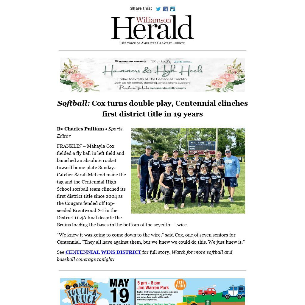 At the top of this eblast you will see buttons to make it easy for you to share this eblast with friends via email, Facebook, Twitter and LinkedIn and follow the Herald. We are listed as wherald, whsports and wherald_ads. Also, like us on FACEBOOK, and don't forget to visit us online at WilliamsonHerald.com. Please patronize our e-blast advertisers and those who advertise and support us in our weekly publication.