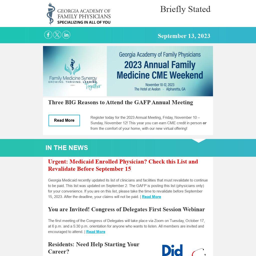 Georgia Medicaid recently updated its list of clinicians and facilities that must revalidate to continue to be paid. This list was updated on September 2. The GAFP is posting this list (physicians only) for your convenience. If you are on this list, please take the time to revalidate before September 15, 2023. After the deadline, your claims will not be paid. | Read More
