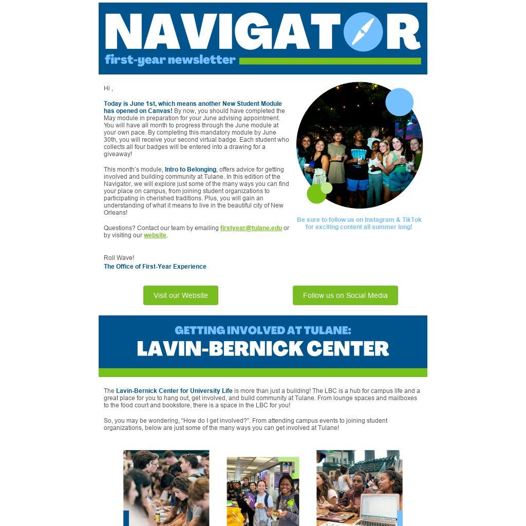 This month’s module, Intro to Belonging, offers advice for getting involved and building community at Tulane. In this edition of the Navigator, we will explore just some of the many ways you can find your place on campus, from joining student organizations to participating in cherished traditions. Plus, you will gain an understanding of what it means to live in the beautiful city of New Orleans!
