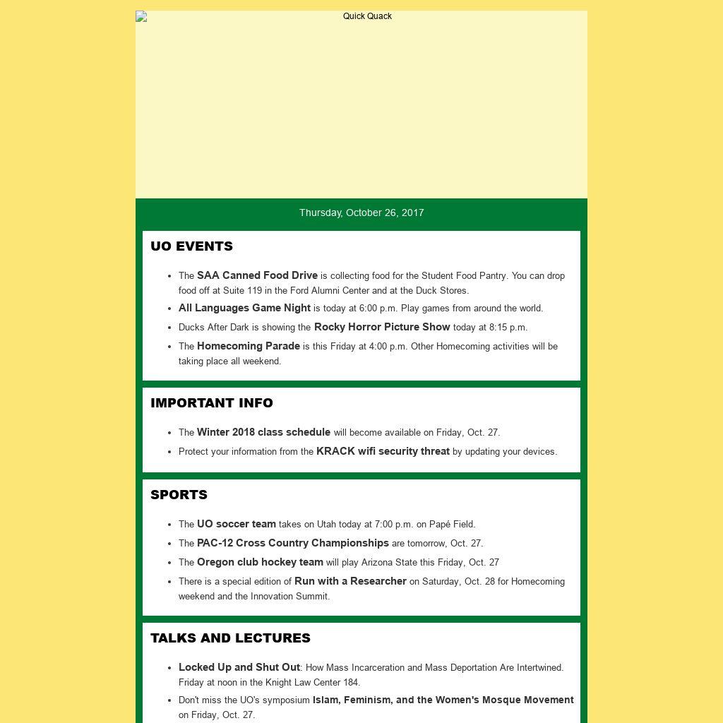 TheSAA Canned Food Drive is collecting food for the Student Food Pantry. You can drop food off at Suite 119 in the Ford Alumni Center and at the Duck Stores.