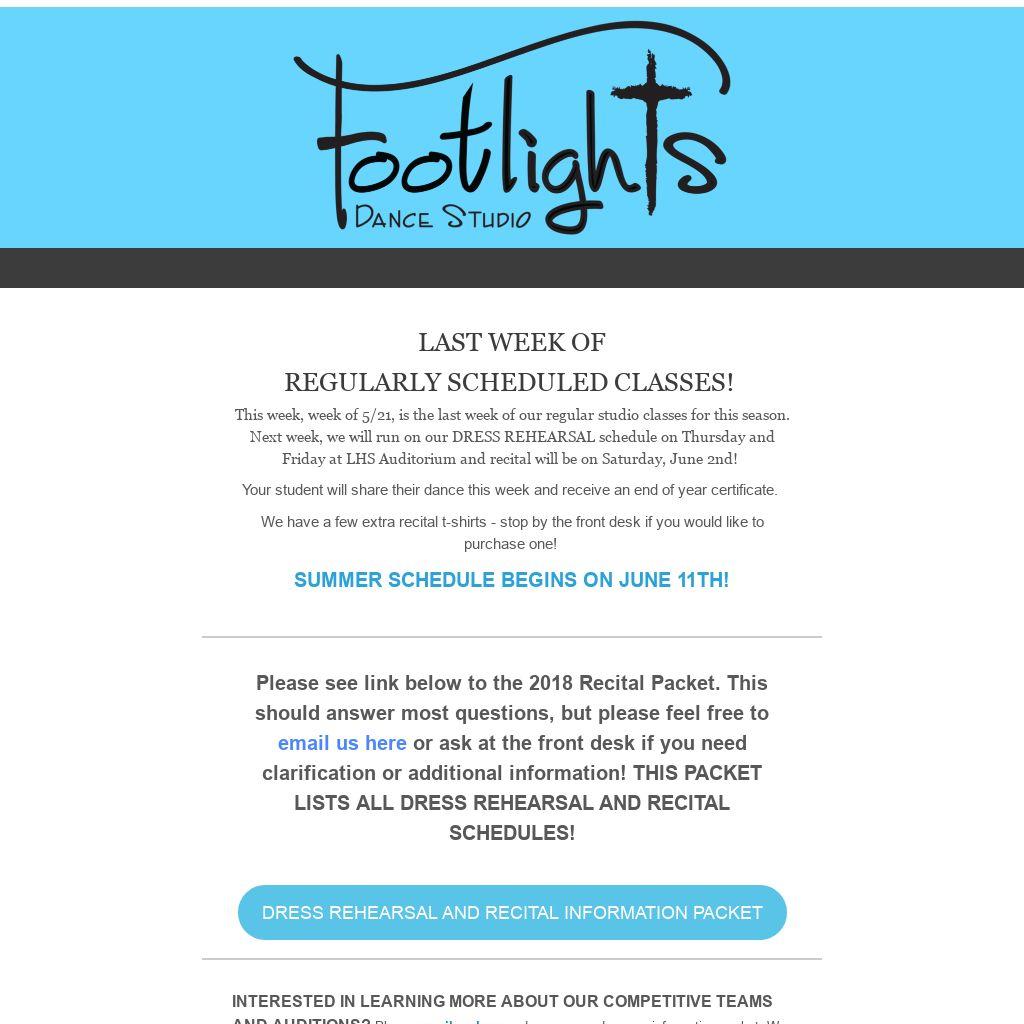 This week, week of 5/21, is the last week of our regular studio classes for this season. Next week, we will run on our DRESS REHEARSAL schedule on Thursday and Friday at LHS Auditorium and recital will be on Saturday, June 2nd!