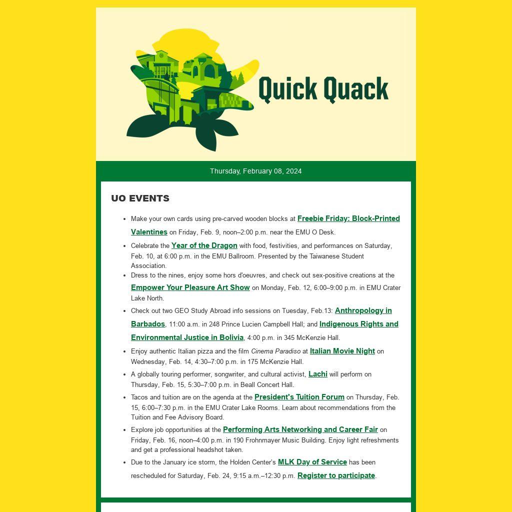 - Celebrate the Year of the Dragon with food, festivities, and performances on Saturday, Feb. 10, at 6:00 p.m. in the EMU Ballroom. Presented by the Taiwanese Student Association.