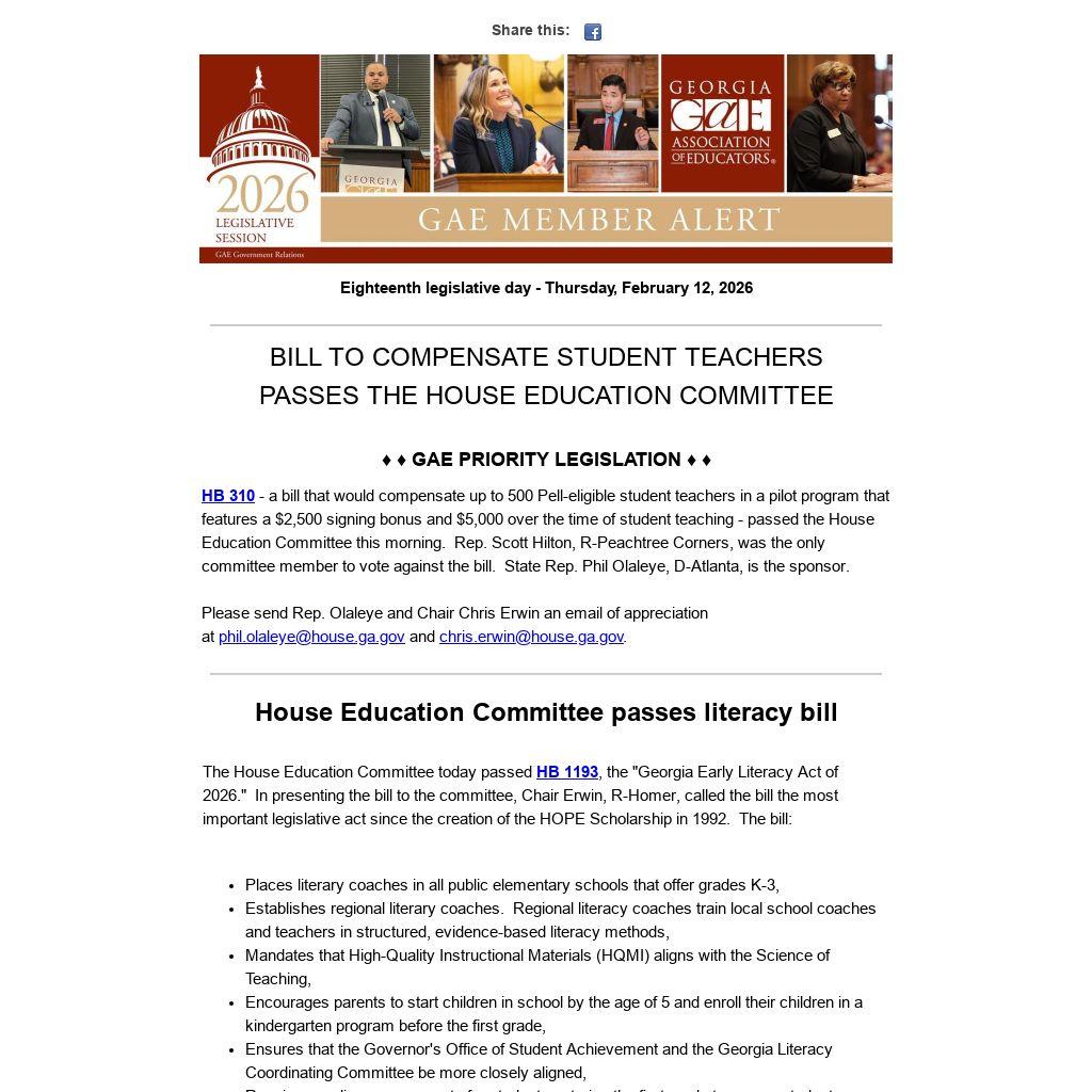 The GAE Legislative Contact Team (LCT) meets next Tuesday, February 17, for a special briefing on the 2026 legislative session. Please join us at 6:30 p.m. and register here.