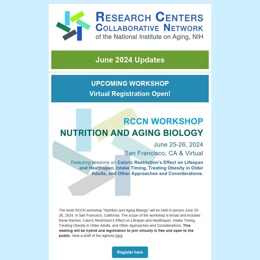 The tenth RCCN workshop “Nutrition and Aging Biology” will be held in-person June 25-26, 2024, in San Francisco, California. The scope of the workshop is broad and includes these themes: Caloric Restriction’s Effect on Lifespan and Healthspan, Intake Timing, Treating Obesity in Older Adults, and Other Approaches and Considerations. This meeting will be hybrid and registration to join virtually is free and open to the public. View a draft of the agenda here.