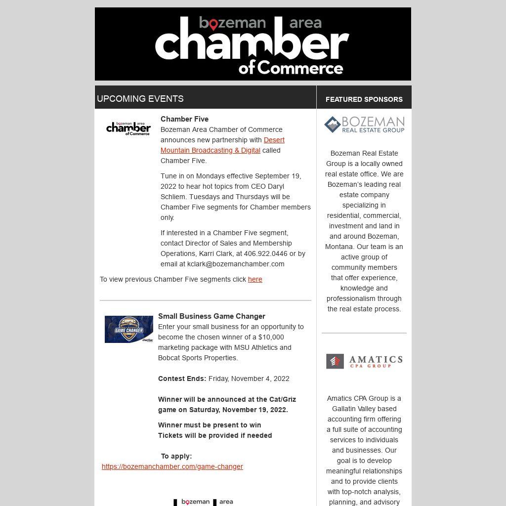If interested in a Chamber Five segment, contact Director of Sales and Membership Operations, Karri Clark, at 406.922.0446 or by email at kclark@bozemanchamber.com