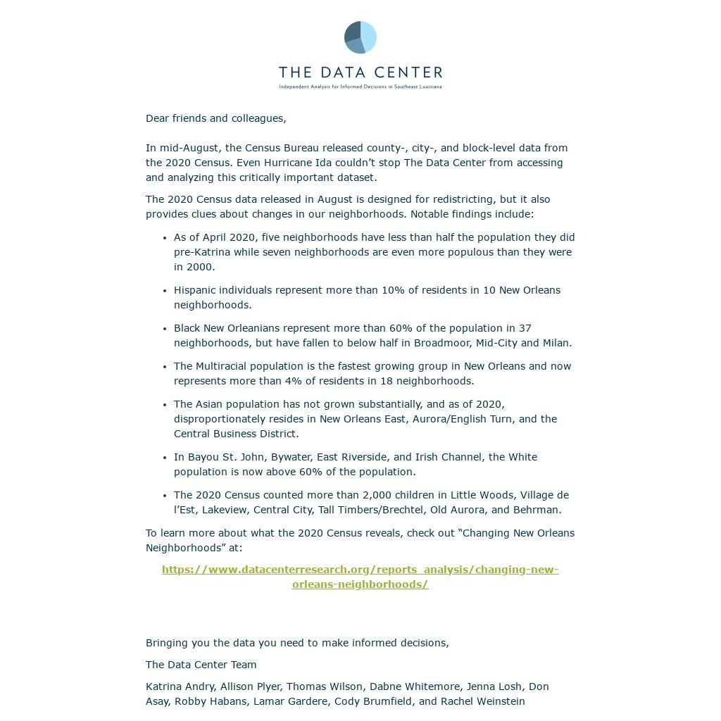 In mid-August, the Census Bureau released county-, city-, and block-level data from the 2020 Census. Even Hurricane Ida couldn’t stop The Data Center from accessing and analyzing this critically important dataset.