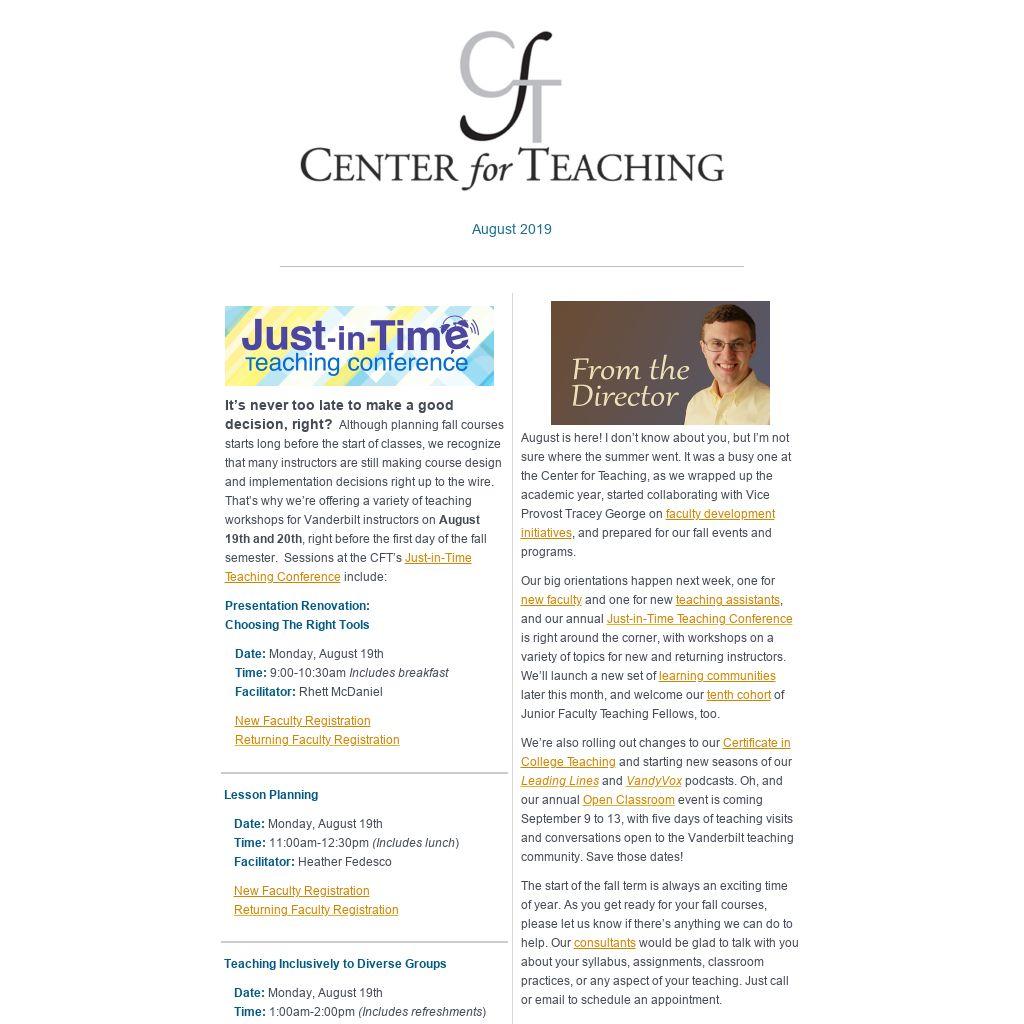 | It’s never too late to make a good decision, right? Although planning fall courses starts long before the start of classes, we recognize that many instructors are still making course design and implementation decisions right up to the wire. That’s why we’re offering a variety of teaching workshops for Vanderbilt instructors on August 19th and 20th, right before the first day of the fall semester. Sessions at the CFT’s Just-in-Time Teaching Conference include: