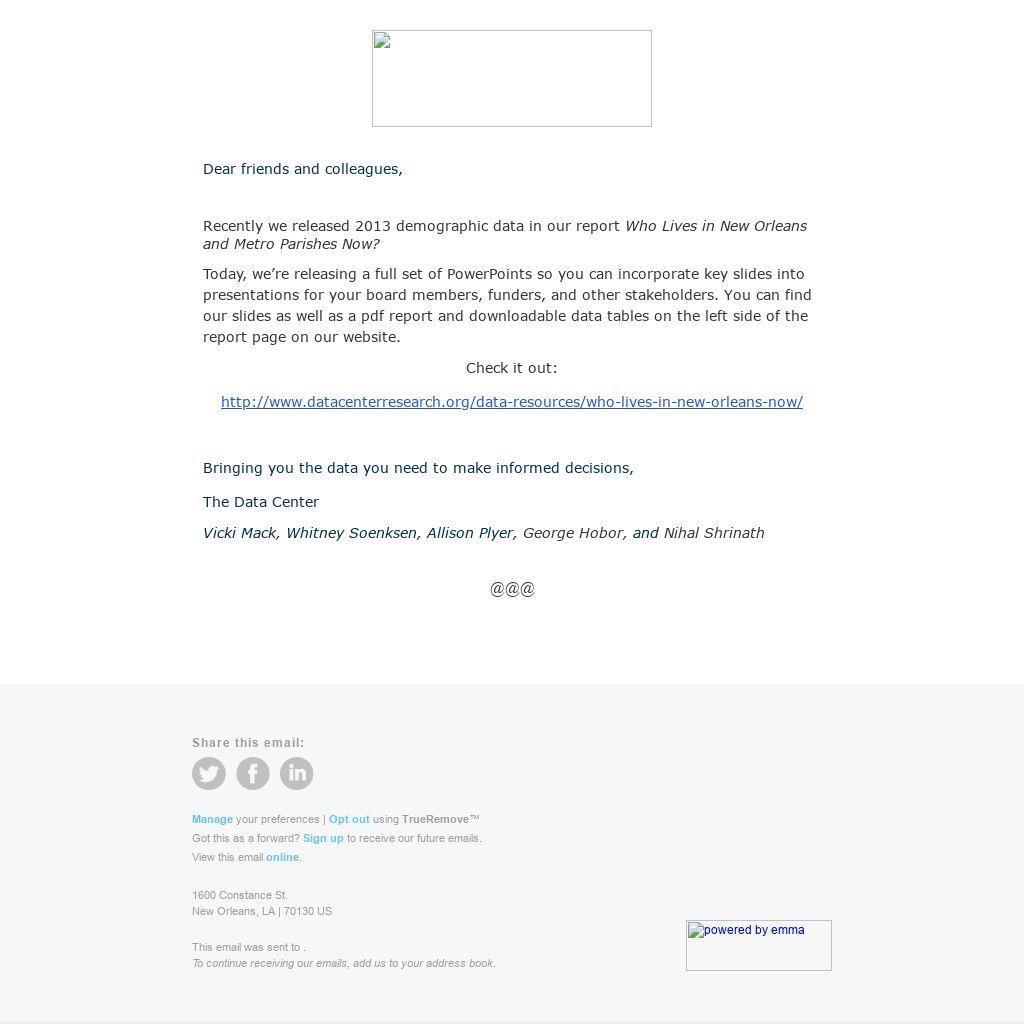 Recently we released 2013 demographic data in our report Who Lives in New Orleans and Metro Parishes Now?