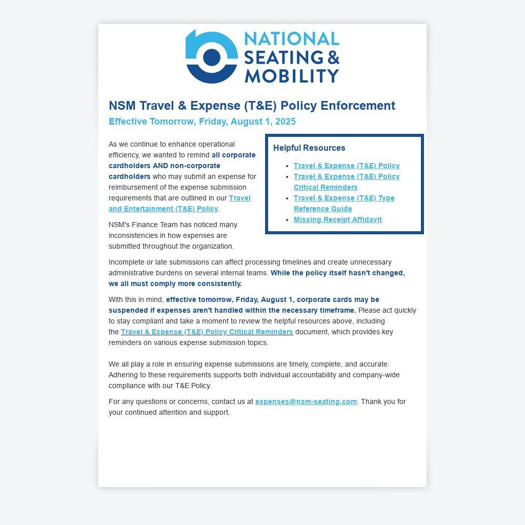 For any questions or concerns, contact us at expenses@nsm-seating.com. Thank you for your continued attention and support.