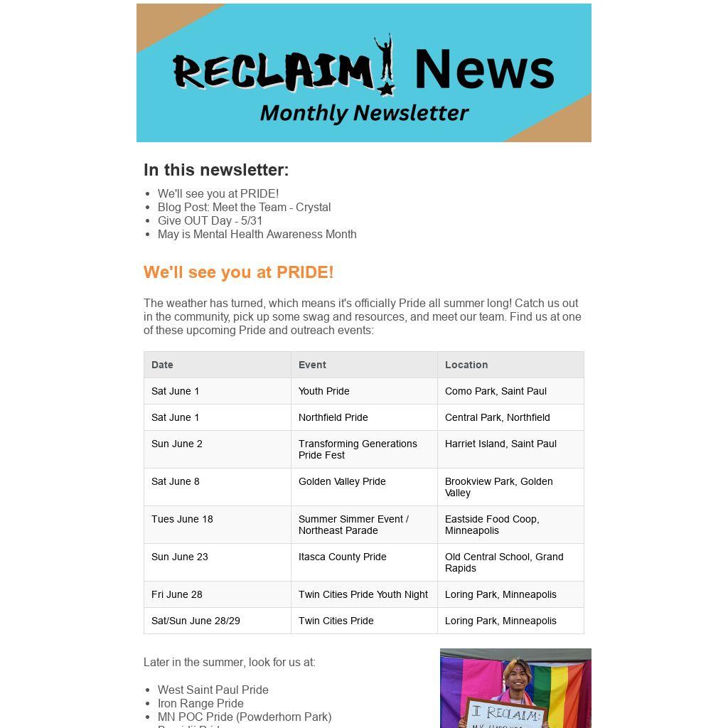 Give OUT Day is the nation's largest fundraising event for LGBTQ+ nonprofits and programs, culminating on May 31. At RECLAIM, we're dedicated to providing accessible mental health care to queer and trans youth regardless of their ability to pay, empowering them to reclaim their lives from oppression in all its forms. The need for such services remains significant, especially in Greater Minnesota where access to culturally competent and affordable care can be scarce. We’re asking for your support to meet this need.
