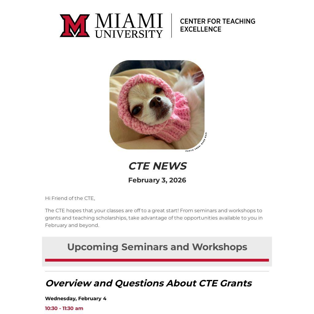 The CTE hopes that your classes are off to a great start! From seminars and workshops to grants and teaching scholarships, take advantage of the opportunities available to you in February and beyond.Â