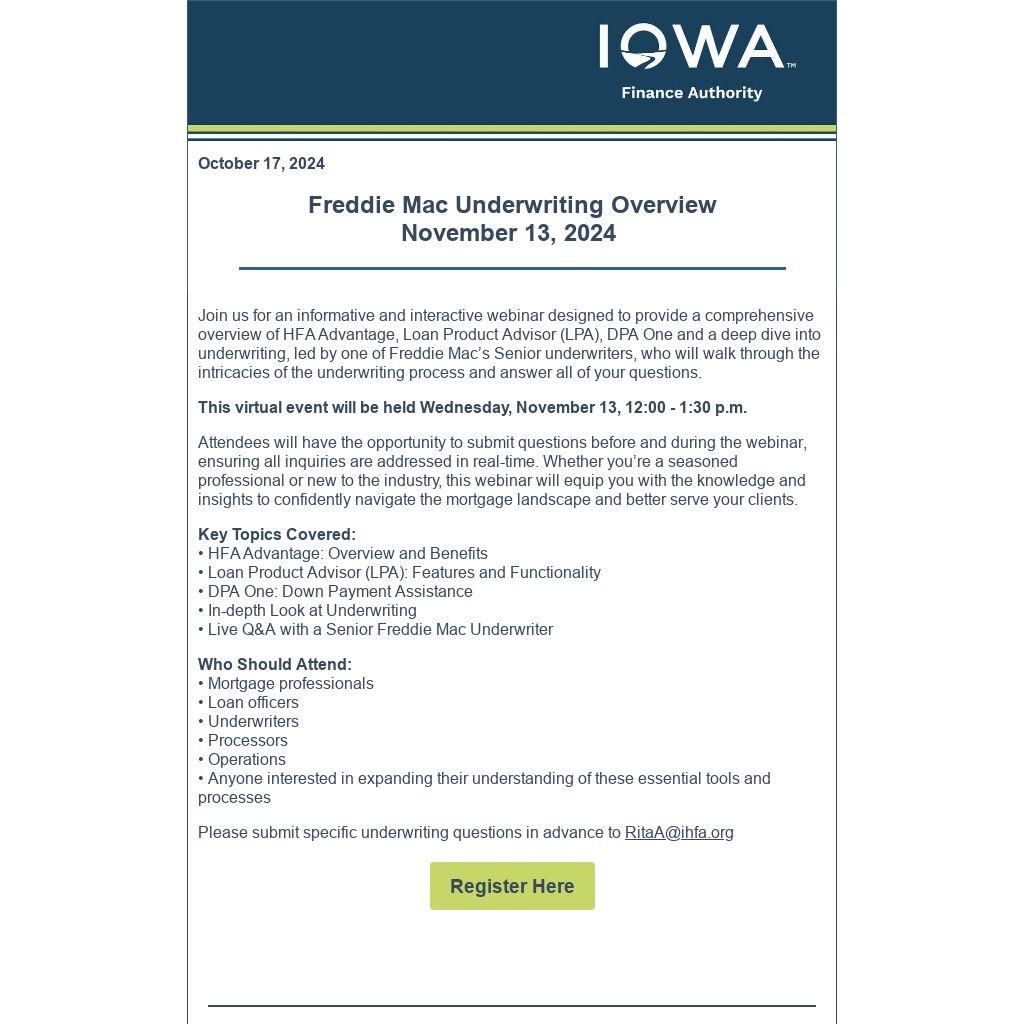 Join us for an informative and interactive webinar designed to provide a comprehensive overview of HFA Advantage, Loan Product Advisor (LPA), DPA One and a deep dive into underwriting, led by one of Freddie Mac’s Senior underwriters, who will walk through the intricacies of the underwriting process and answer all of your questions.