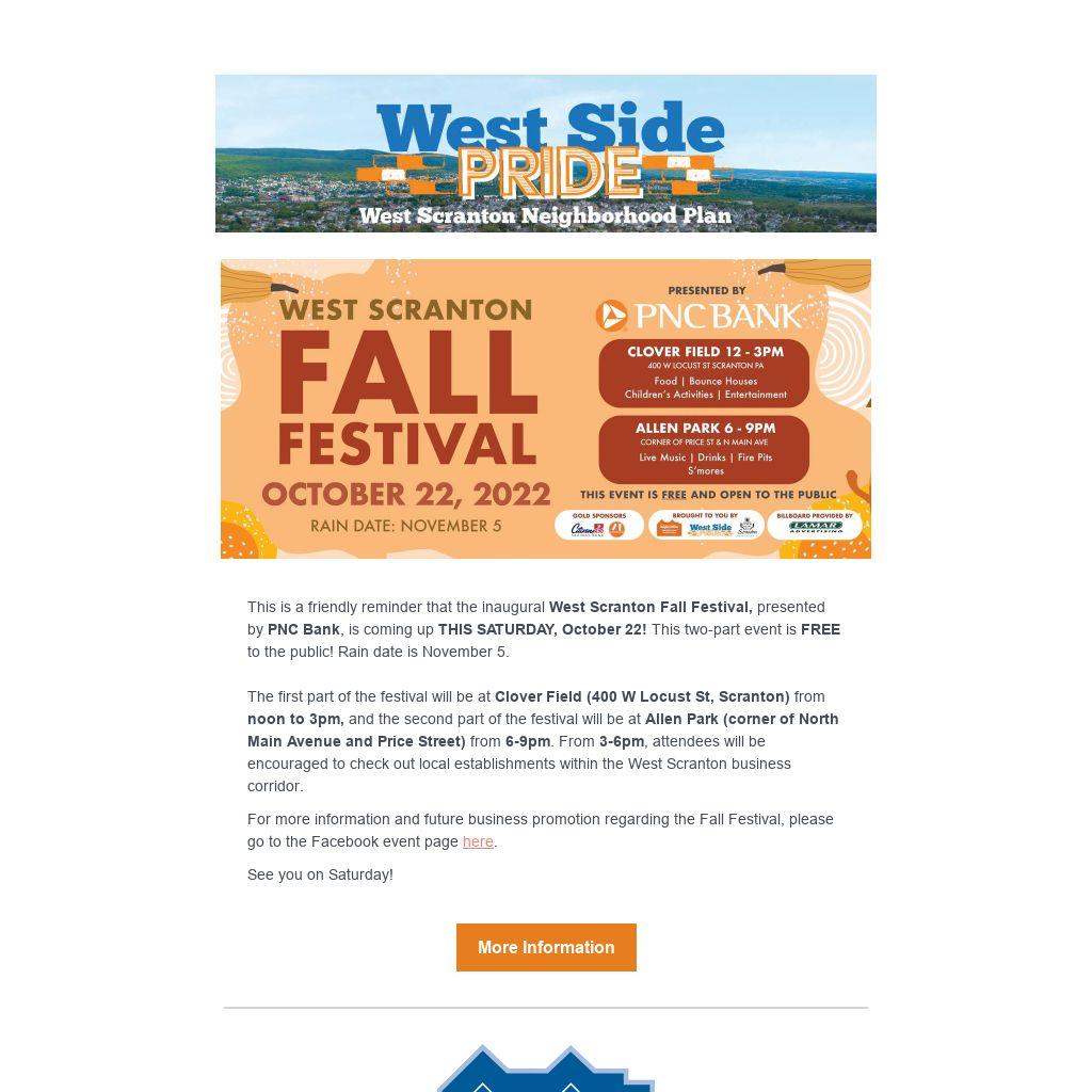 This is a friendly reminder that the inaugural West Scranton Fall Festival, presented by PNC Bank, is coming up THIS SATURDAY, October 22! This two-part event is FREE to the public! Rain date is November 5.