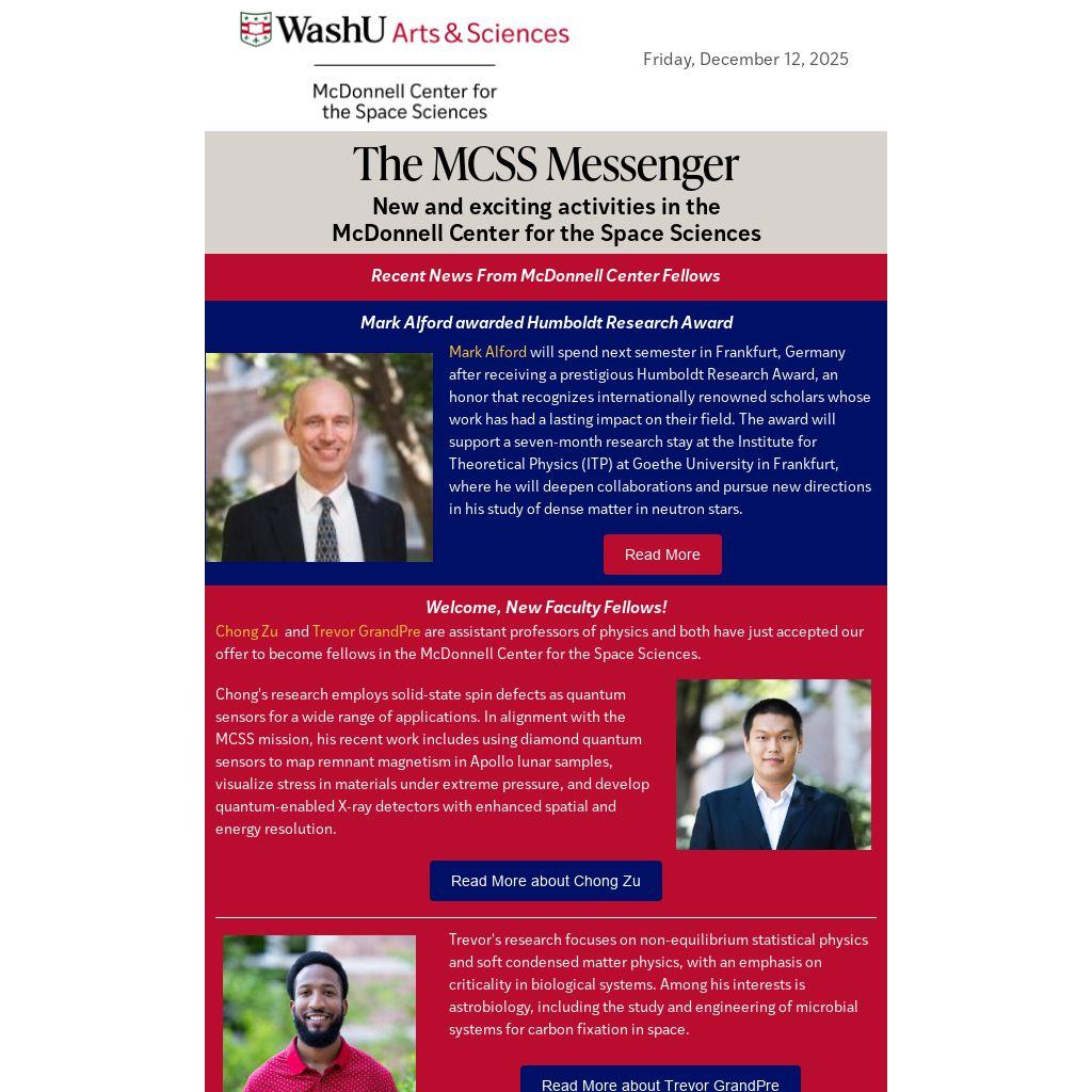 Chong Zu and Trevor GrandPre are assistant professors of physics and both have just accepted our offer to become fellows in the McDonnell Center for the Space Sciences.