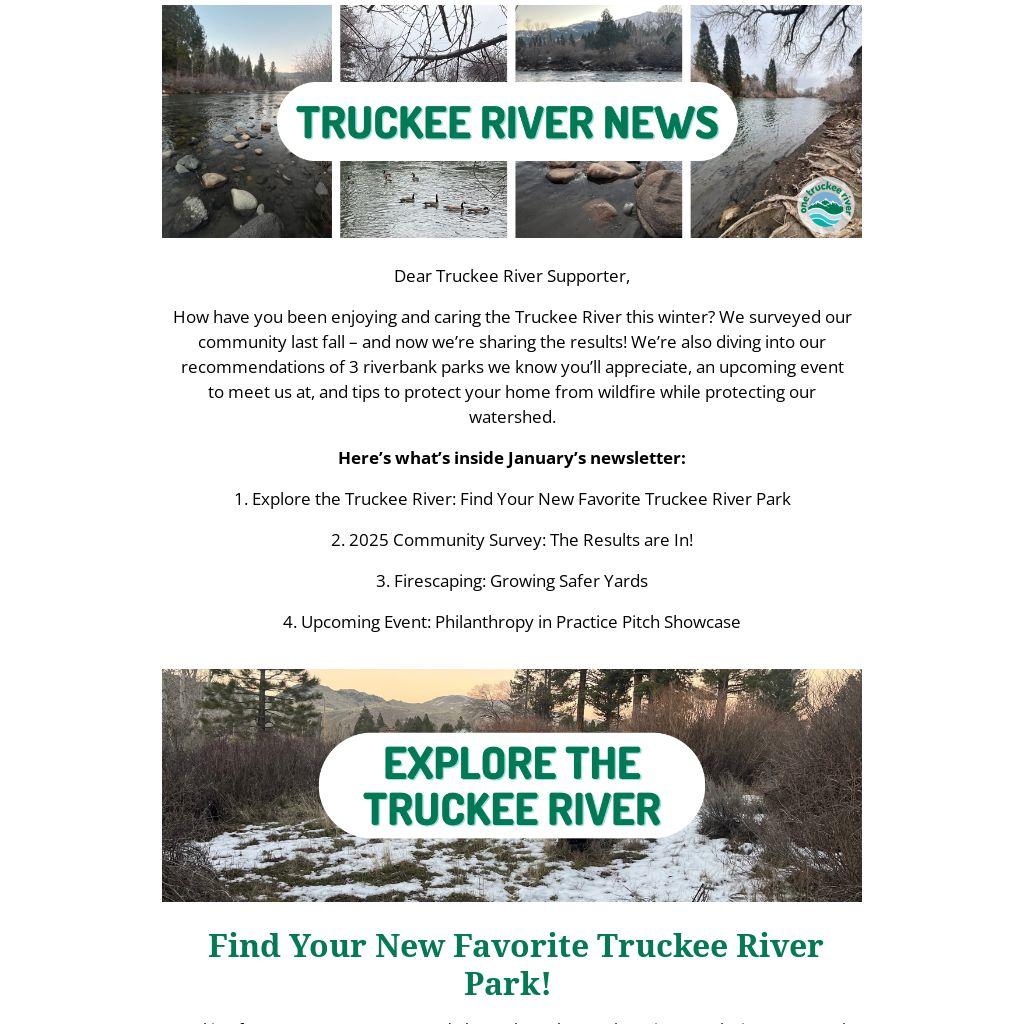 How have you been enjoying and caring the Truckee River this winter? We surveyed our community last fall – and now we’re sharing the results! We’re also diving into our recommendations of 3 riverbank parks we know you’ll appreciate, an upcoming event to meet us at, and tips to protect your home from wildfire while protecting our watershed.