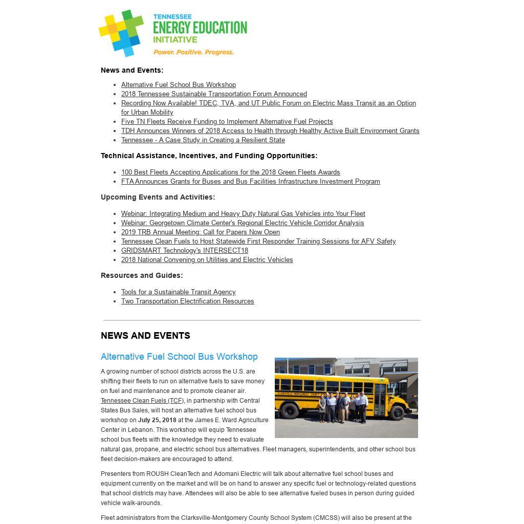 | Alternative Fuel School Bus Workshop A growing number of school districts across the U.S. are shifting their fleets to run on alternative fuels to save money on fuel and maintenance and to promote cleaner air. Tennessee Clean Fuels (TCF), in partnership with Central States Bus Sales, will host an alternative fuel school bus workshop on July 25, 2018 at the James E. Ward Agriculture Center in Lebanon. This workshop will equip Tennessee school bus fleets with the knowledge they need to evaluate natural gas, propane, and electric school bus alternatives. Fleet managers, superintendents, and other school bus fleet decision-makers are encouraged to attend. Presenters from ROUSH CleanTech and Adomani Electric will talk about alternative fuel school buses and equipment currently on the market and will be on hand to answer any specific fuel or technology-related questions that school districts may have. Attendees will also be able to see alternative fueled buses in person during guided vehicle walk-arounds. Fleet administrators from the Clarksville-Montgomery County School System (CMCSS) will also be present at the workshop to highlight their experiences with alternative fuel adoption. CMCSS is Tennessee’s largest alternative fuel school bus fleet. By July 2018, CMCSS is expected to have a total of 23 propane-school buses in operation. Additional speakers from TCF and the Tennessee Department of Environment and Conservation’s Office of Energy Programs will address upcoming funding opportunities to assist with the purchase of alternative fuel school buses. Visit U.S. DOE's Alternative Fuel Data Center to learn more about the alt fuels available to local school districts. To RSVP for this workshop, please click here. The workshop will be free for all attendees. Lunch will be provided. For questions about the workshop, please contact Alexa Voytek at alexa.voytek@tn.gov or 615-532-0238.