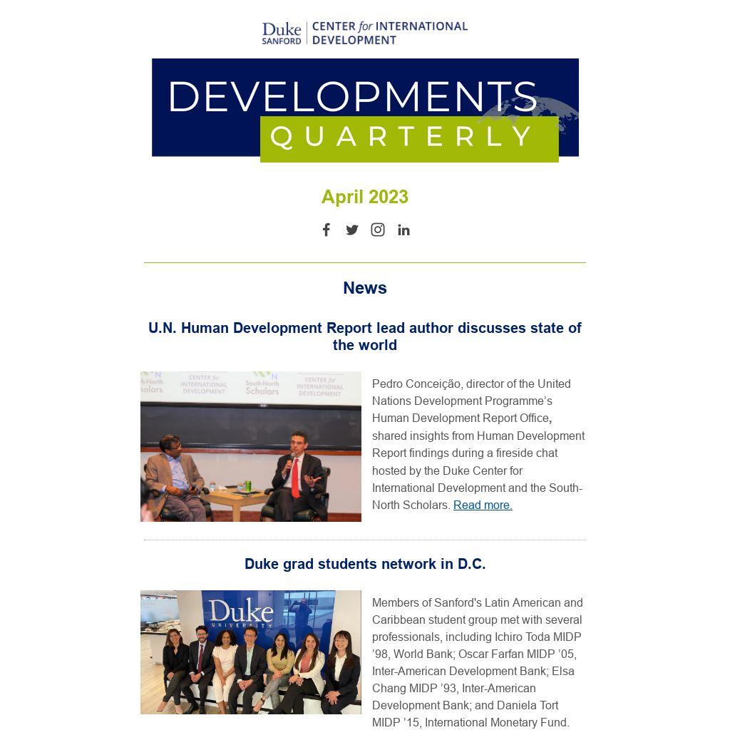 Pedro Conceição, director of the United Nations Development Programme’s Human Development Report Office, shared insights from Human Development Report findings during a fireside chat hosted by the Duke Center for International Development and the South-North Scholars. Read more.