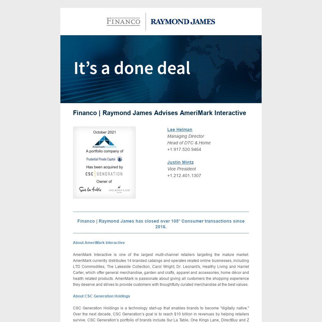 Financo | Raymond James has closed over 105* Consumer transactions since 2016.