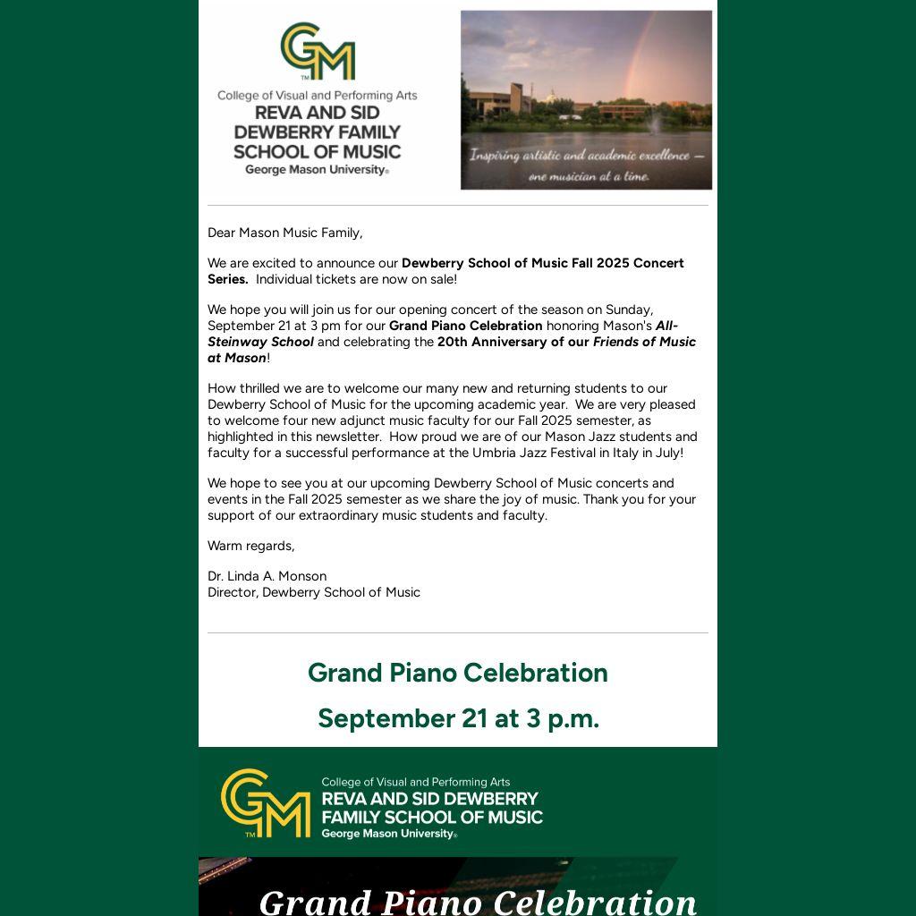 Join us for a spectacular opening of our 2025 Fall Concert season with A Grand Piano Celebration on Sunday, September 21 at 3 p.m. in Mason's Center for the Arts. This concert honors Mason's All-Steinway School and the 20th Anniversary of the Friends of Music at Mason. Outstanding student and faculty artists of the Reva and Sid Dewberry Family School of Music at George Mason University will be on stage to display their marvelous talents. The concert will be led by Dr. Linda Apple Monson, International Steinway Artist. Additional piano faculty artists include Dr. Anna Balakerskaia, Dr. John Healey, and Dr. Eunae Ko Han. Professor Jennifer Casey Cabot, soprano, and guest artist Dr. Kris Monson, bassist, will also perform in this celebratory event.