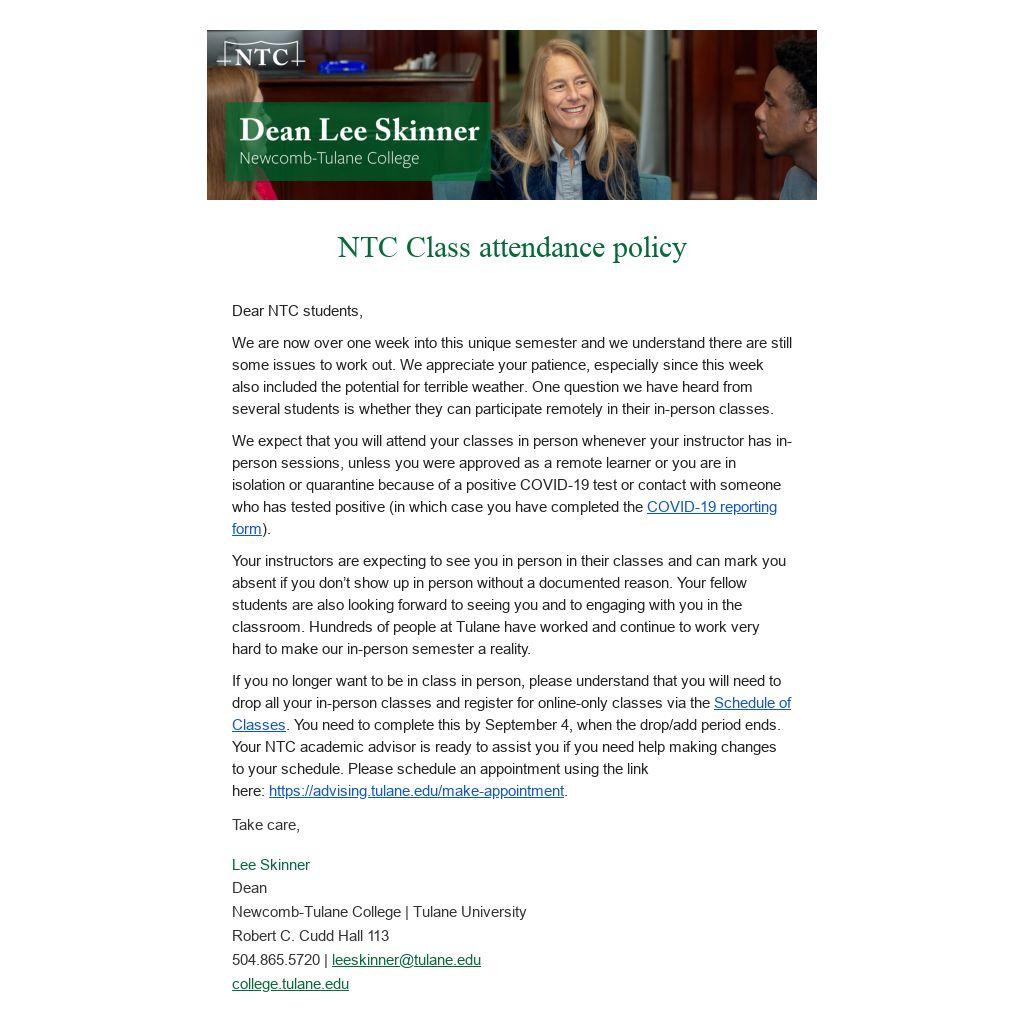 If you no longer want to be in class in person, please understand that you will need to drop all your in-person classes and register for online-only classes via the Schedule of Classes. You need to complete this by September 4, when the drop/add period ends. Your NTC academic advisor is ready to assist you if you need help making changes to your schedule. Please schedule an appointment using the link here: https://advising.tulane.edu/make-appointment.