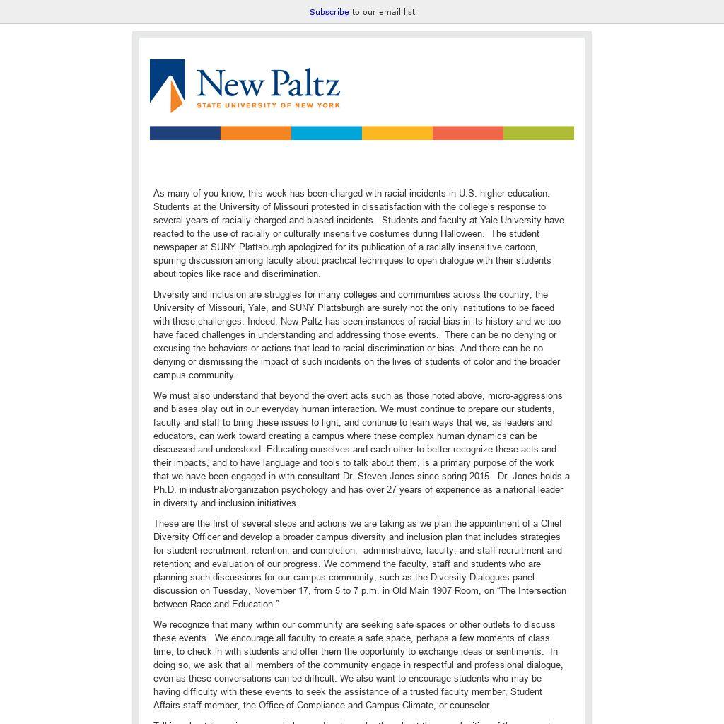 Diversity and inclusion are struggles for many colleges and communities across the country; the University of Missouri, Yale, and SUNY Plattsburgh are surely not the only institutions to be faced with these challenges. Indeed, New Paltz has seen instances of racial bias in its history and we too have faced challenges in understanding and addressing those events. There can be no denying or excusing the behaviors or actions that lead to racial discrimination or bias. And there can be no denying or dismissing the impact of such incidents on the lives of students of color and the broader campus community.