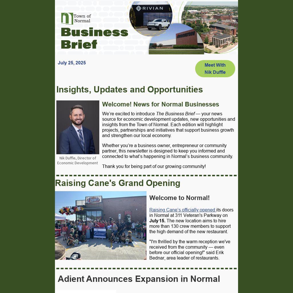 We’re excited to introduce The Business Brief — your news source for economic development updates, new opportunities and insights from the Town of Normal. Each edition will highlight projects, partnerships and initiatives that support business growth and strengthen our local economy.