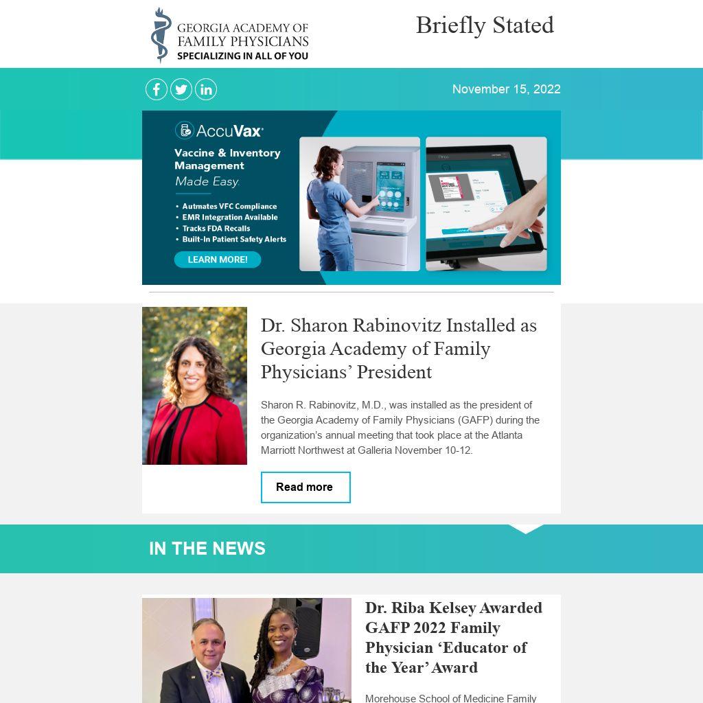 Copyright 2022 Georgia Academy of Family Physicians To ensure that e-mails from GAFP are delivered to your inbox, please add gafp@gafp.org to your address book or list of approved senders.