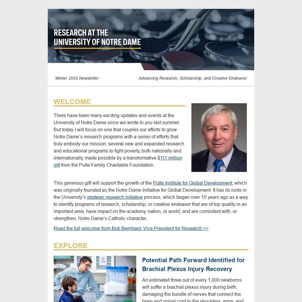 There have been many exciting updates and events at the University of Notre Dame since we wrote to you last summer. But today I will focus on one that couples our efforts to grow Notre Dame’s research programs with a series of efforts that truly embody our mission: several new and expanded research and educational programs to fight poverty, both nationally and internationally, made possible by a transformative $111 million gift from the Pulte Family Charitable Foundation.
